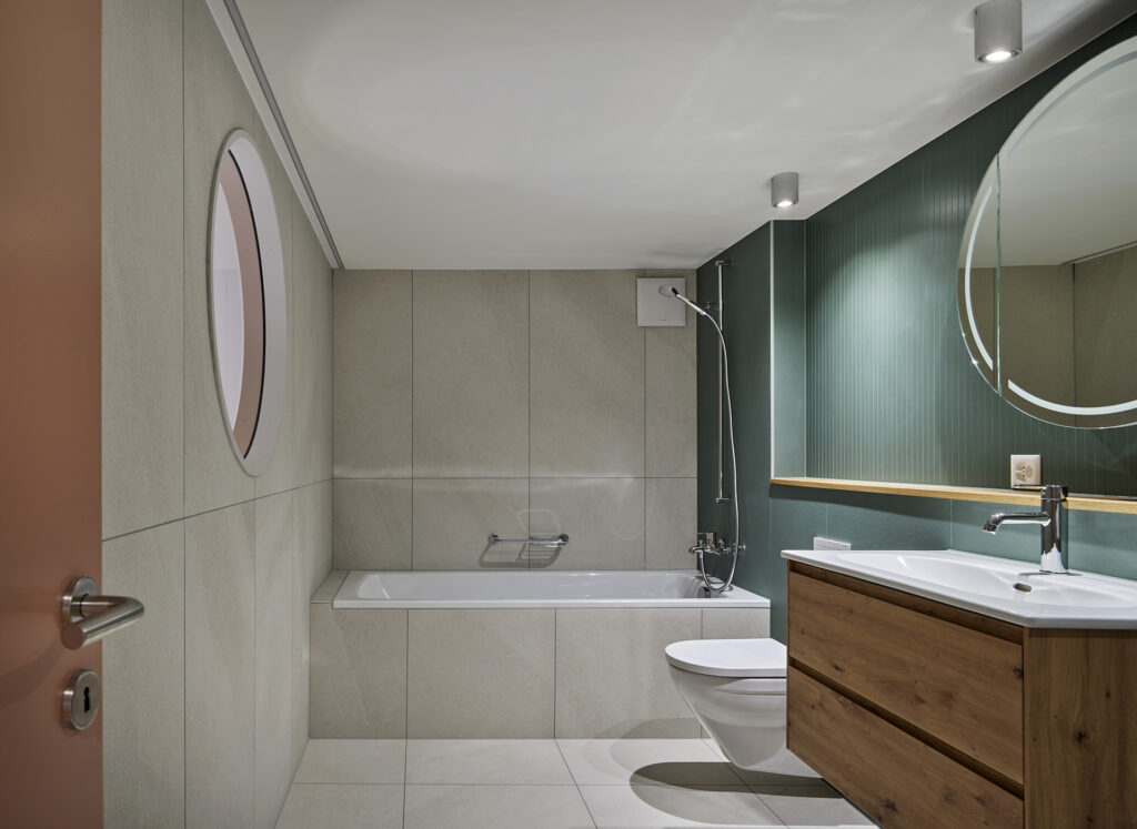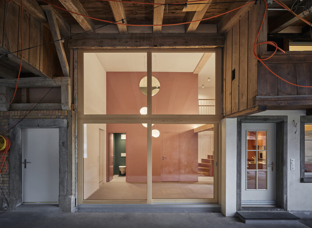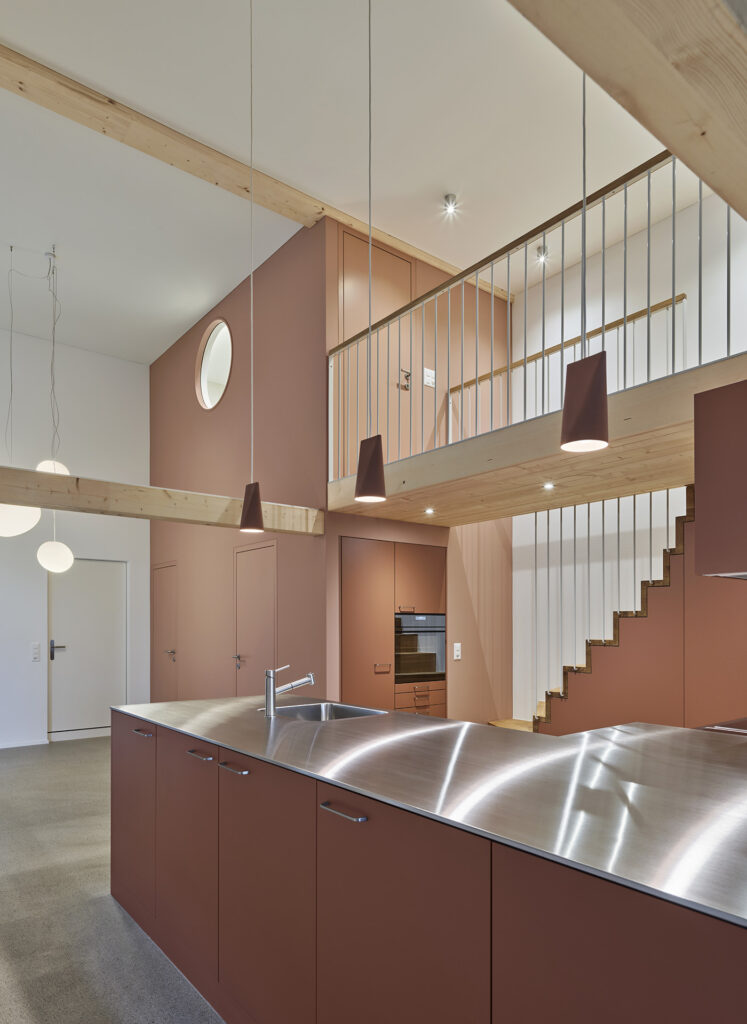 Das Dach wurde in den 40er Jahren komplett erneuert, vor 20 Jahren mit neuen Ziegeln eingedeckt und vor 10 Jahren mit einer Photovoltaikanlage versehen. Ein Dachausbau mit einer Erneuerung der Dachhaut wäre daher unverhältnismässig und zu teuer. Deshalb wurde die dritte Wohnung im Dachgeschoss als «Haus im Haus» entworfen.