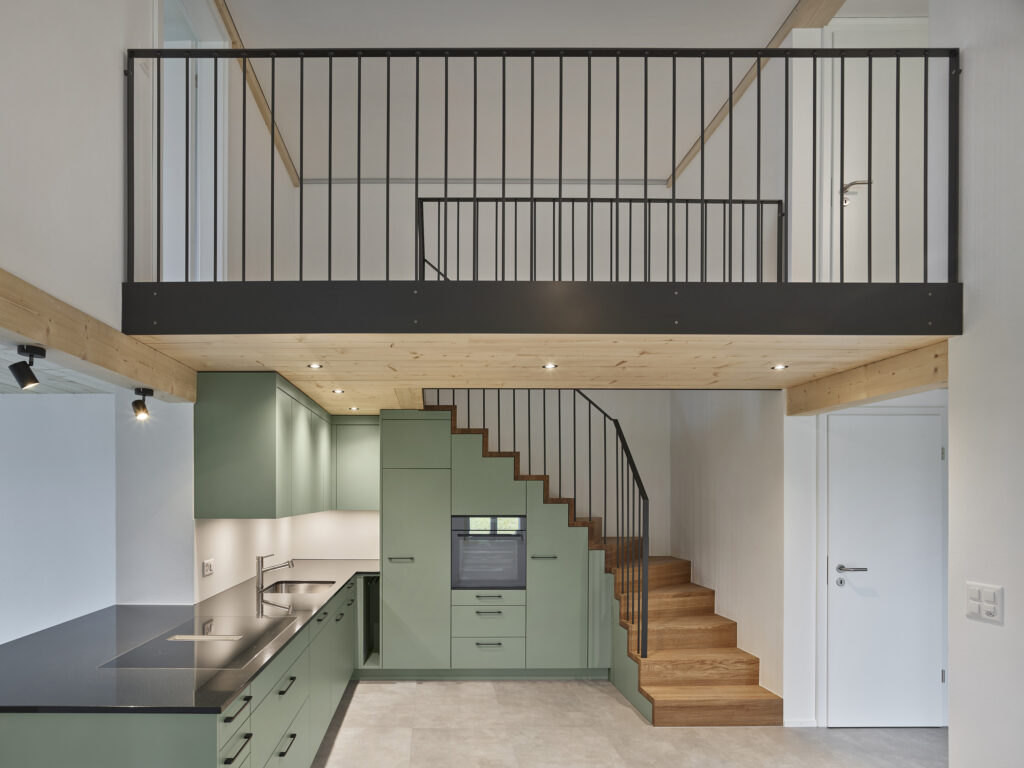 Im Dachgeschoss entstand die dritte Wohnung mit Zugang über die Hocheinfahrt.