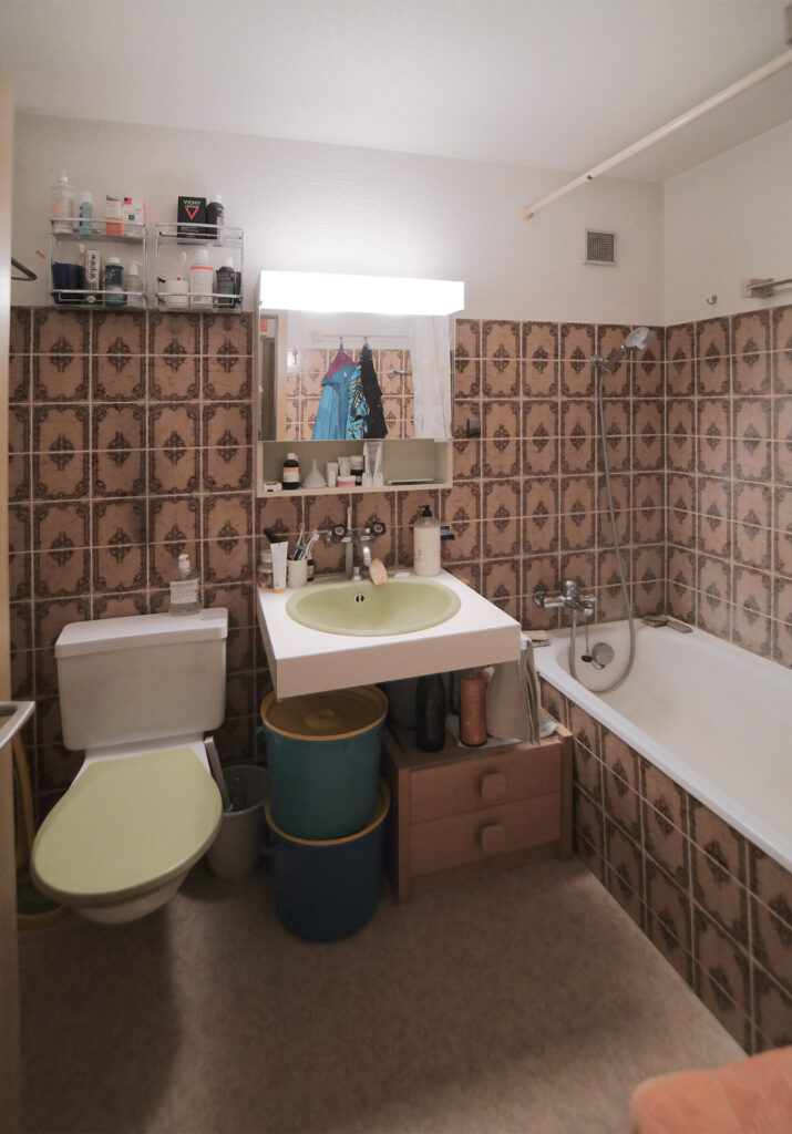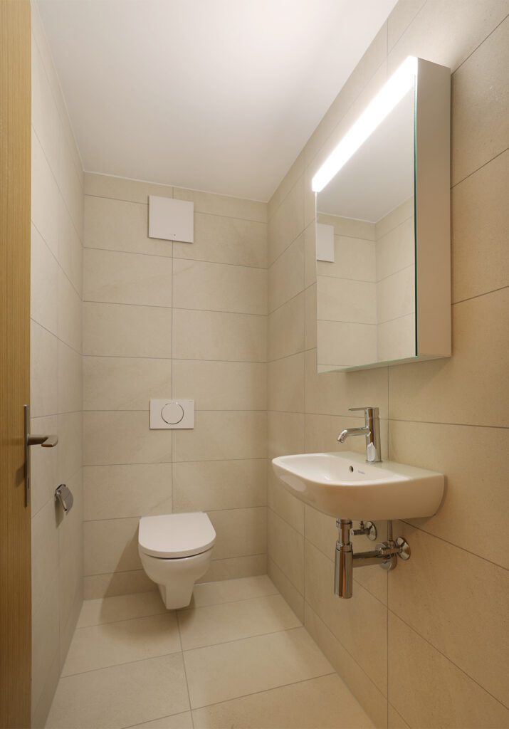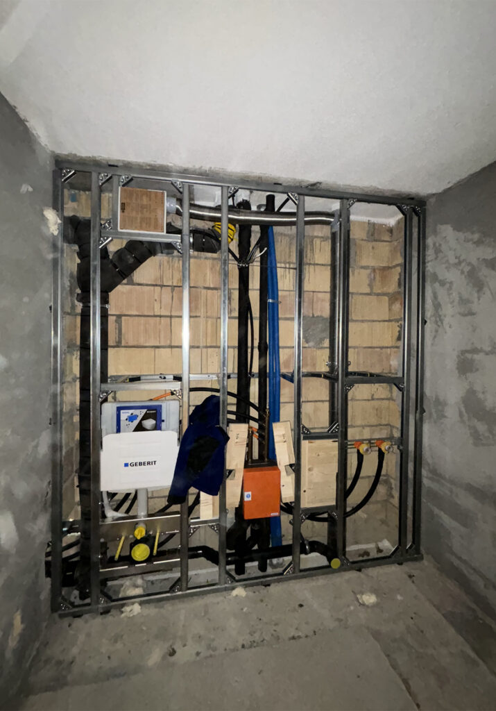 Die Nasszellen und Küchen der 7 Mietwohnungen mit Jahrgang 1988 waren sanierungsbedürftig. Von Beginn der Projektierung war klar, dass nicht nur die Oberflächen und die Apparate ersetzt werden sollen, sondern auch die gesamte Steigzone, inkl. Sammelleitungen, erneuert werden soll. Seit Jahren kam es zu oft zu Verstopfugnen in den alten und teils mit Kontergefälle verlegten Sammelleitungen.